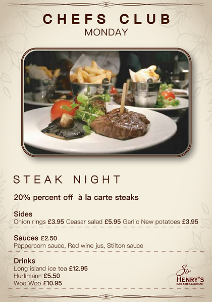 Start your week with something special. Every Monday at Sir Henrys, enjoy 20% off all à la carte steaks, each one sourced from grass‑fed Australian or British cattle. Expect rich flavour, natural tenderness, and quality you can taste — all at a price that makes Monday feel like a treat.